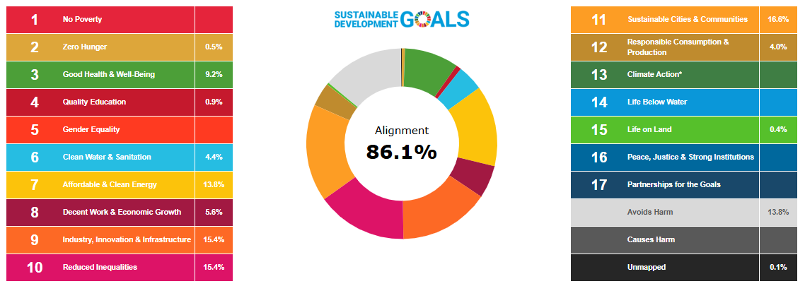 Percentages may not add up to 100% as they are rounded to the nearest decimal. Global Goals with no figure indicate the portfolio has 0% exposure; this is because either the Global Goal presents few investable opportunities, or companies within the portfolio provide exposure to multiple goals and the most relevant goal has been selected. *The Climate Action goal overlaps with more specific goals, so we have instead mapped our exposure to these.